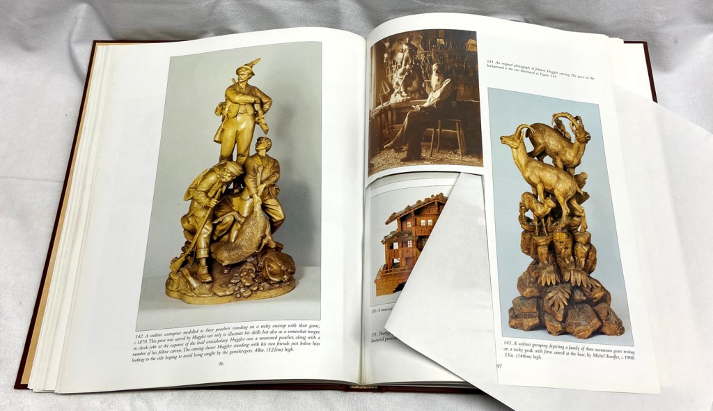 FAULTS — A FEW ILLUSTRATIONS AND PAGES HAVE BEEN CUT OUT — Recently we purchased a large collection which included duplicate copies of a number of books. One copy we would find with no problems, and the second copy would have ILLUSTRATIONS CUT OUT, it appears to have been done to help with customer design work. Thus this copy priced at $65 – still of value in your carving work. For comparison, we have a second copy of SWISS CARVINGS in our shop, with dustjacket and no cut pages for $195.
