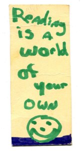 Here is a “museum” page that I wanted to begin in the late-1990s, but has sat in drawers. Back in the early 1990s the books in collections that I purchased were early, and often with wonderful ephemera tucked inside, including bookmarks or bookmarkers. I pulled them out, and set them aside. I was ‘hooked” especially when this two-sided handmade marker, by Michele, tumbled out of a book. What a bright and intelligent child.