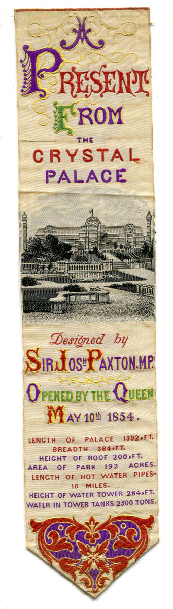 To the left is my earliest bookmarker, a woven silk from the 1854 Crystal Palace Exhibition in London (click for a larger view). Early this January I received an email stating “…I am a book collector in Chicago and a member of the Newberry Library, a large research library. I have a collection of book store and book seller book marks. Eventually my collection will be archived at the Newberry. I am now trying to expand my collection.” He was asking if I could add my bookmarks to his collection. I just needed a nudge. So, thanks to a pandemic, and a snow-storm on Ground-Hog Day, 2021, this page has begun. Please stop by and watch it grow – I have hundreds of fine examples of book marks to share here with you. Thank you, RAY