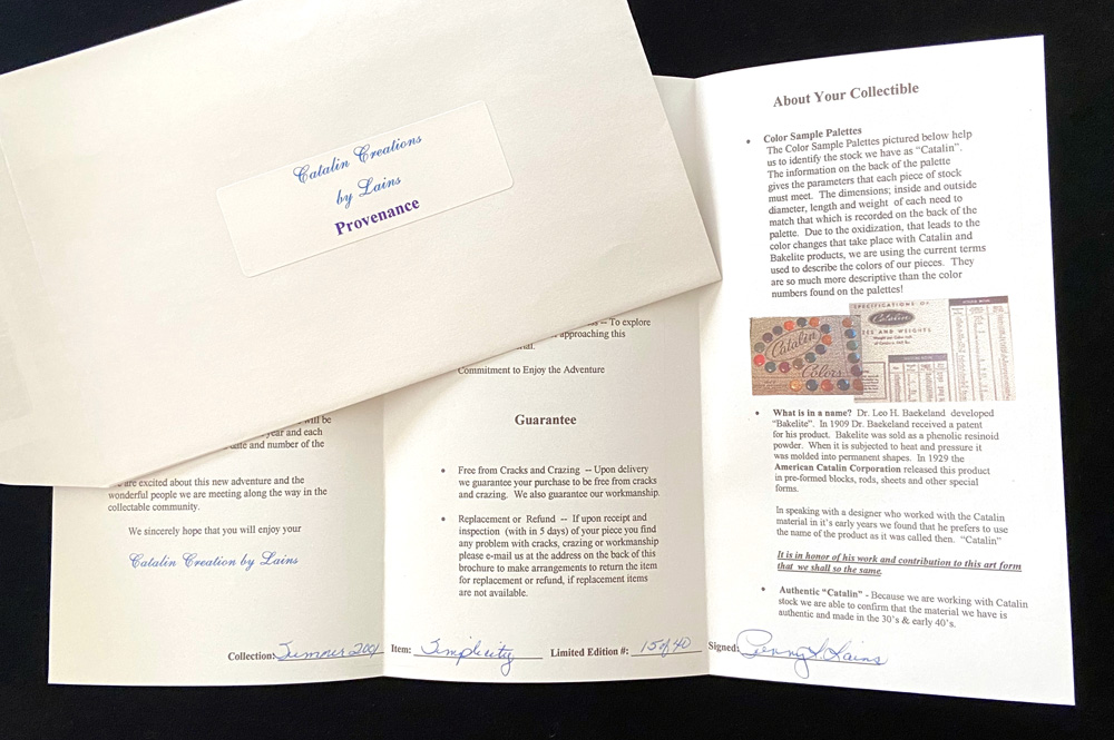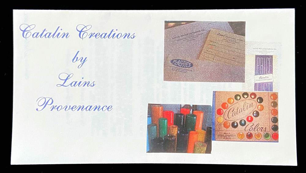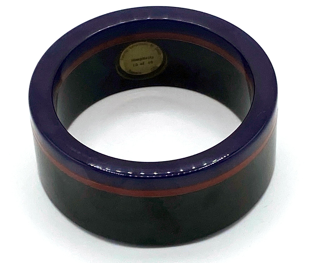 In the summer of 2001, Dan and Penny Lains announced to members of the Vintage Fashion Costume Jewelry (VFCJ) members that they were going to be producing limited bangles from Catalin and Bakelite stock remaining from the family business, LAMACO – The Lains Manufacturing Company which distributed Catlin in 1939-42, closing when the war began. The located material had been stored by the family for 60 years. Catalin was developed in 1927 by the American Catalin Corporation as a brand of thermosetting polymer. This followed the expiration of the Bakelite patent.
