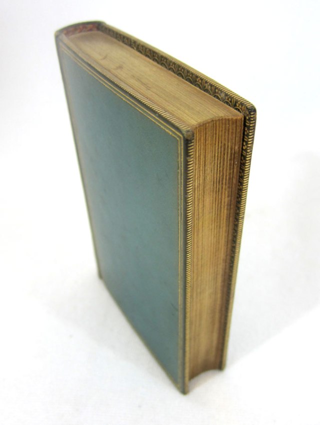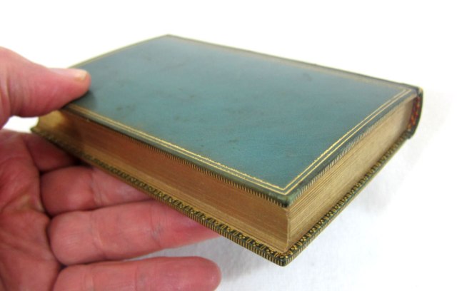 Published by George G. Harrap and Co., London, no date given for this reprint, but most likely early 20th century. Full leather binding with raised bands, gilt stampings, all edges gilt (AEG), and marbled endpapers, 287 pages. Stamped is “Bound by Riviere & Son” which means bound after 1880. This little volume measures about 3 5/8 by 5 1/4 inches. As is typical with the green dyes used on leather, due do sun and atmosphere the spine has changed color to brown. BUT, sitting on the shelf looking at the handsome spine you would not know the boards are green.