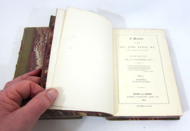 1869 – 3/4 LEATHER – SIR J. T. COLERIDGE – A MEMOIR OF THE REV. JOHN KEBLE, M.A. LATE VICAR OF HURSLEY