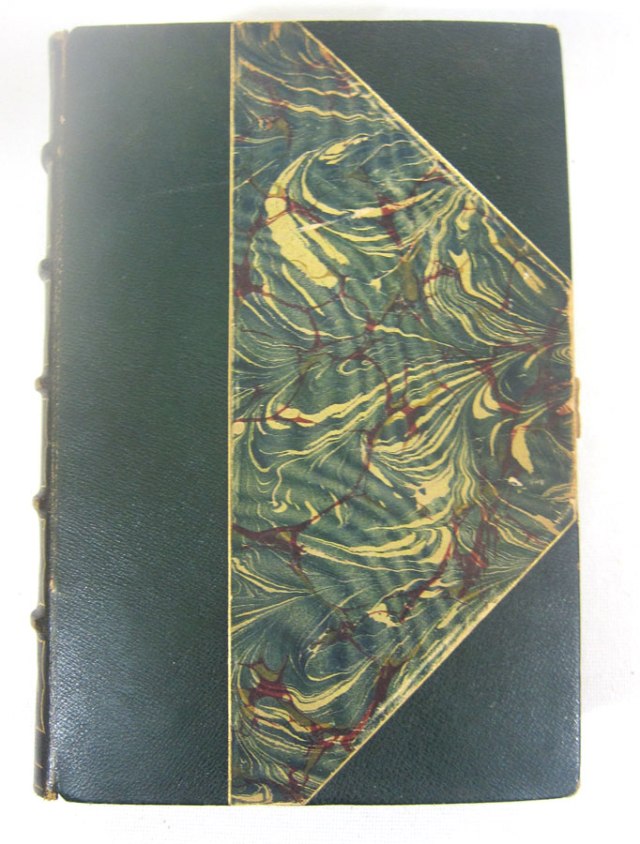 Nice clean and tight copy, green leather, 5 raised bands with 6 compartments with nice gilt stampings, marbled boards and endpapers – some wear lower corners and on marbled paper on foredge of boards as seen in images.