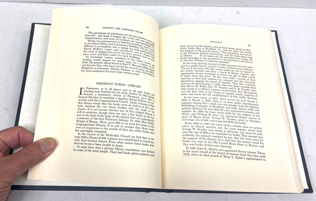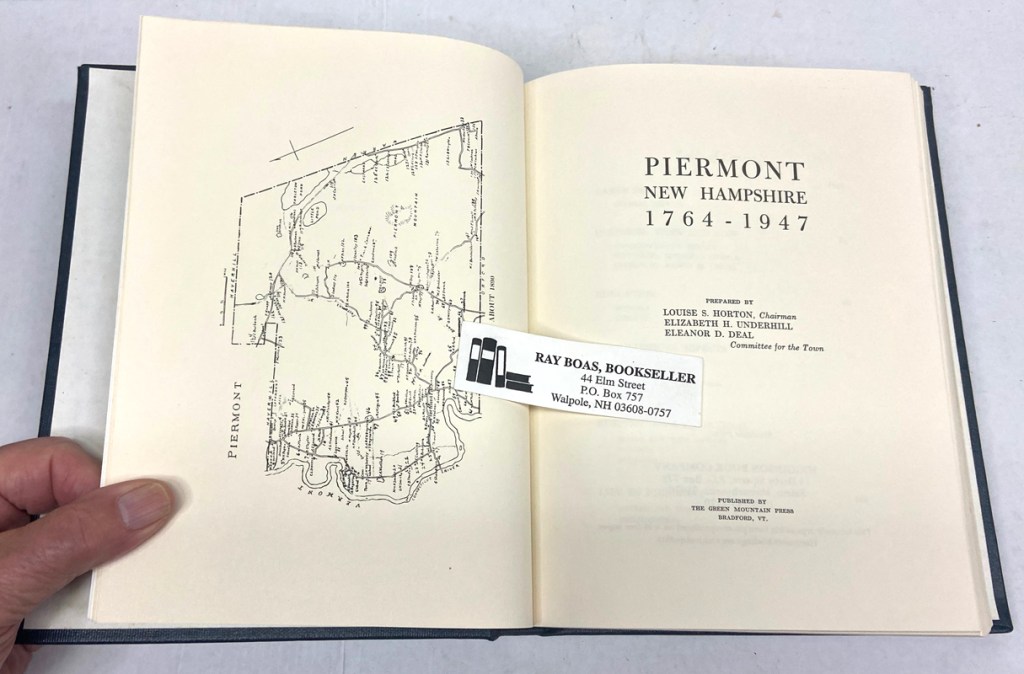 PIERMONT NEW HAMPSHIRE, 1764-1947 – Horton, Louise S.; Underhill, Elizabeth H.; and, Deal, Eleanor D. (prepared by) – Published by: Higginson Book Company quality reprint – 236pp Originally printed c1947 by The Green Mountain Press, Bradford, VT. Contents include: Early Settlers; Religion: Then And Now; Education; Geographical Aspects; Business Life In General; Life In Piermont; Historical Sketches; Family Histories; Genealogies; Those Who Served; Anecdotes. very good, blue buckram cloth (hardcover) — $30 immediately sold to customer asking for images after he looked, and shipped less than an hour later.
