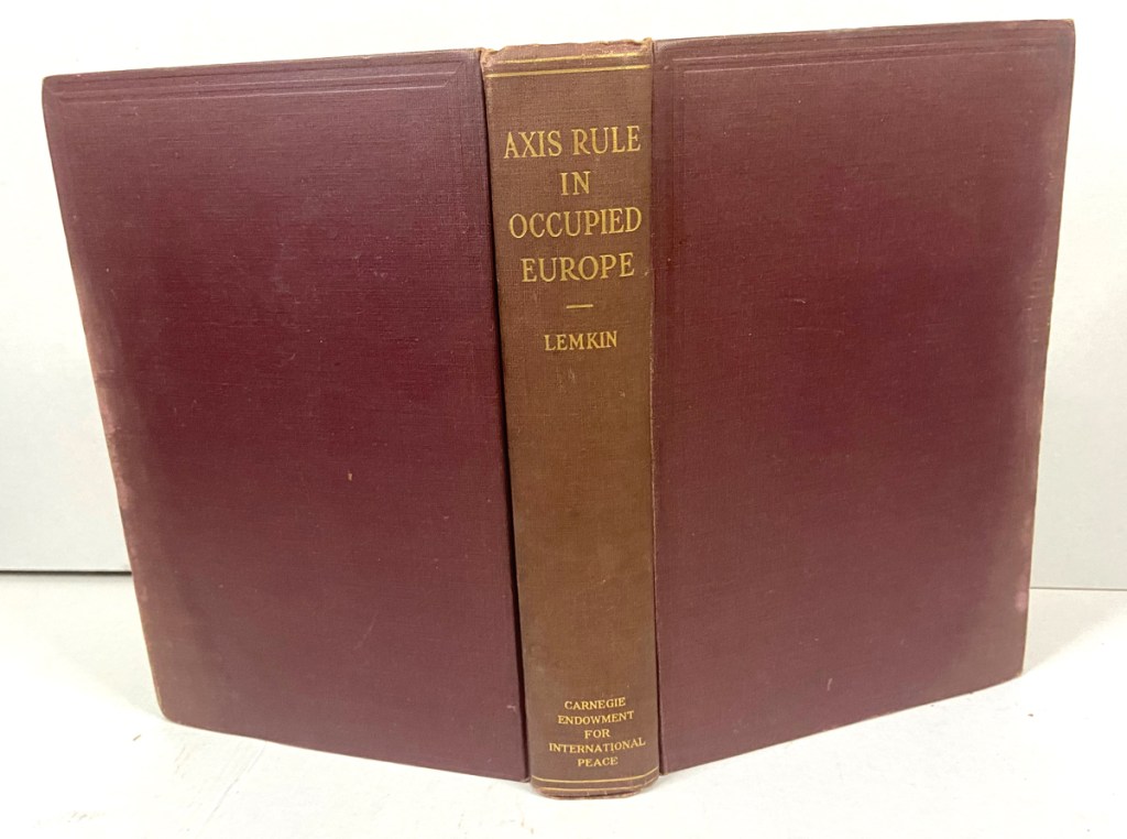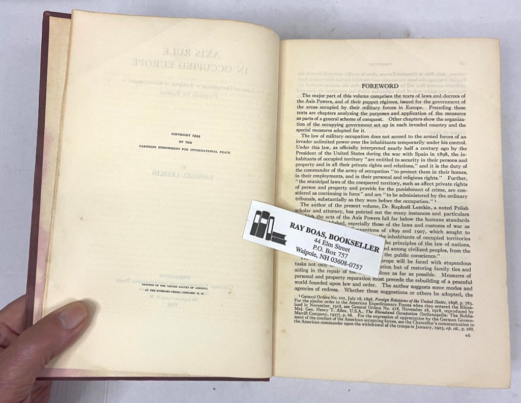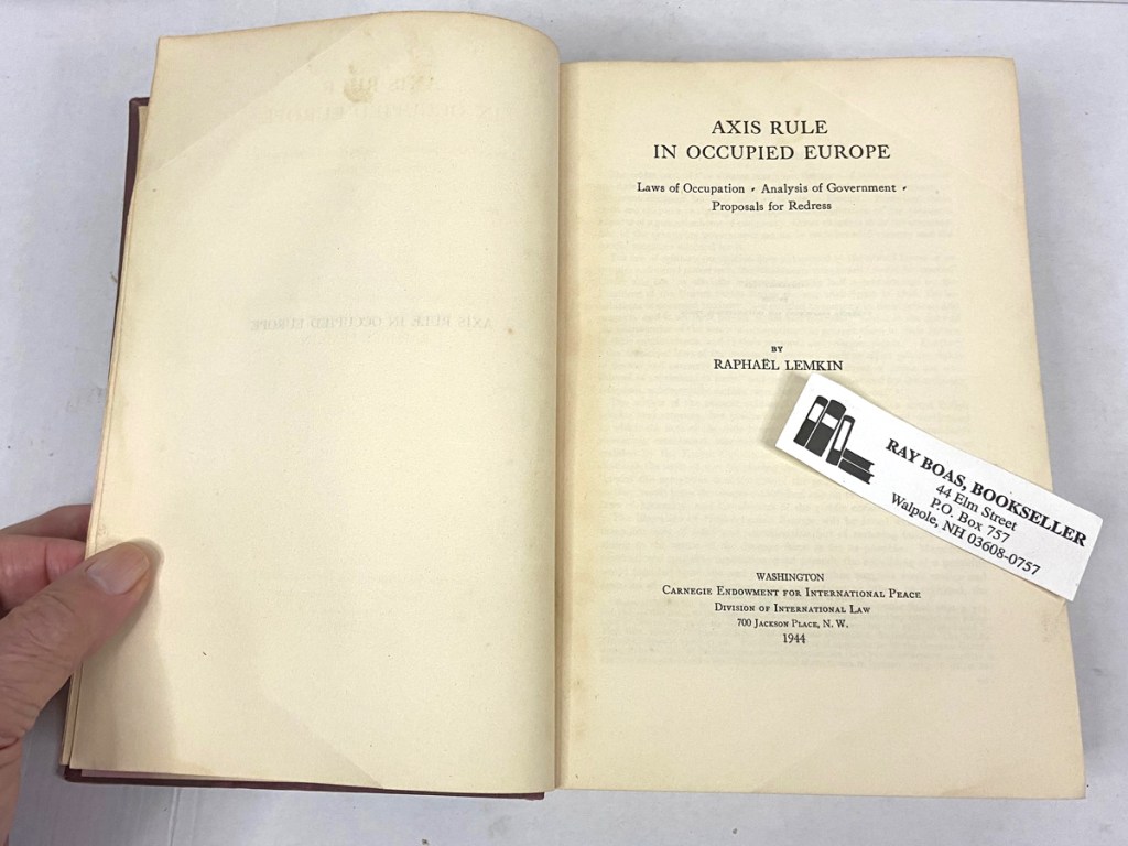 AXIS RULE IN OCCUPIED EUROPE: LAWS OF OCCUPATION – ANALYSIS OF GOVERNMENT – PROPOSALS FOR REDRESS – [Original 1944 Edition — date of 1944 on both title and copyright pages – no other dates or statement of edition or printing. Carnegie Endowment Intl Pea., Washington, DC, 1944, 674pages – Light dampstain foredge of cover boards ONLY. — $200
