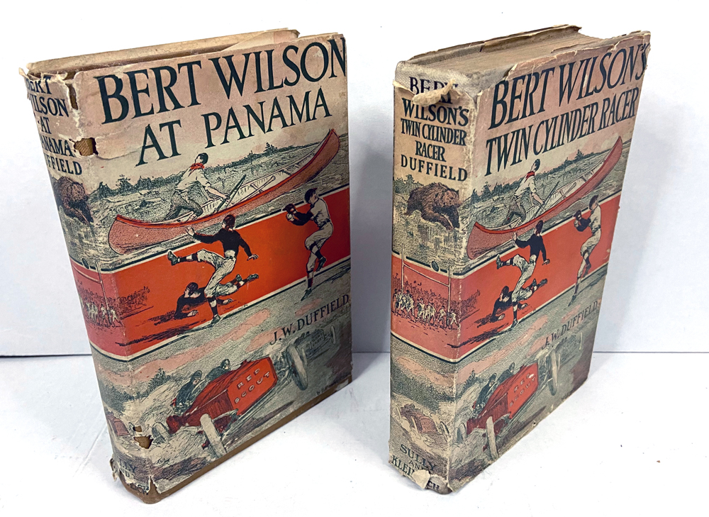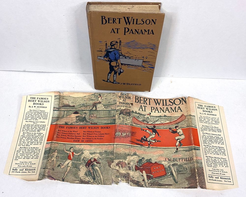 BERT WILSON AT PANAMA by J. W. Duffield – 205pp, ads Uncommon with dustjacket. Books list four books in First Series, and four books in Second Series to IN THE ROCKIES. IMPORTANT — DAMSTAIN TO THE BOTTOM CORNER OF THE BOOK BLOCK – NO PAGES EVER STUCK, but obvious. But, what you are buying here is the dustjacket. good w/lightly chipped dustjacket (hardcover) – 69727 – $ 15.00
