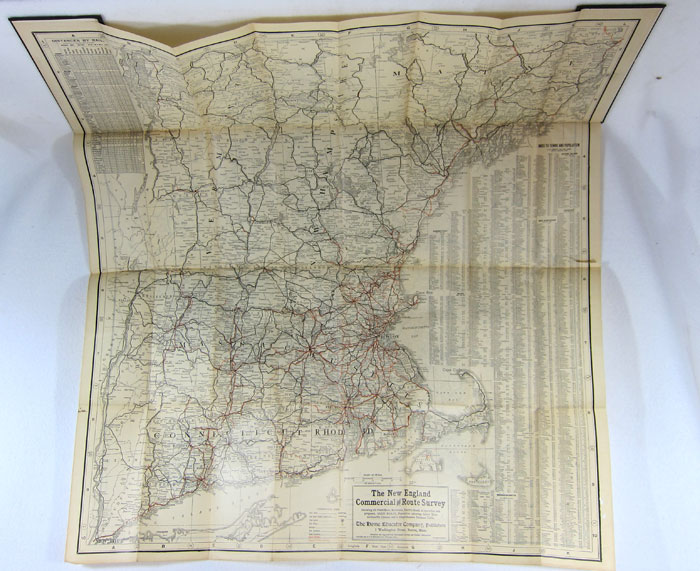 1905 – NEW ENGLAND COMMERCIAL AND ROUTE SURVEY -Showing all Postoffices, Railroads, Electric Roads in Operation and Proposed, GOOD ROADS, Population (showing latest Massachusetts census), and a Comprehensive Distance Table. Published by THE HOME EDUCATOR COMPANY, Boston, Massachusetts. Compiled and Engraved from Government Surveys and Original Information. Copyright 1905, F. S. Blanchard & Co., Worcester, MA. Engraved two-sided folding map. Southern New England on one side with a map of the state of Maine on the opposite side. Opened up, measures about 32 5/8 inches by 36 1/2 inches.Folds down into board folder that measures about 4 1/2 inches by 9 1/2 inches – one small closed tear about two inches – some small pinholes at multiple fold spots – Price $25 SOLD immediately to customer requesting images – Thank You.