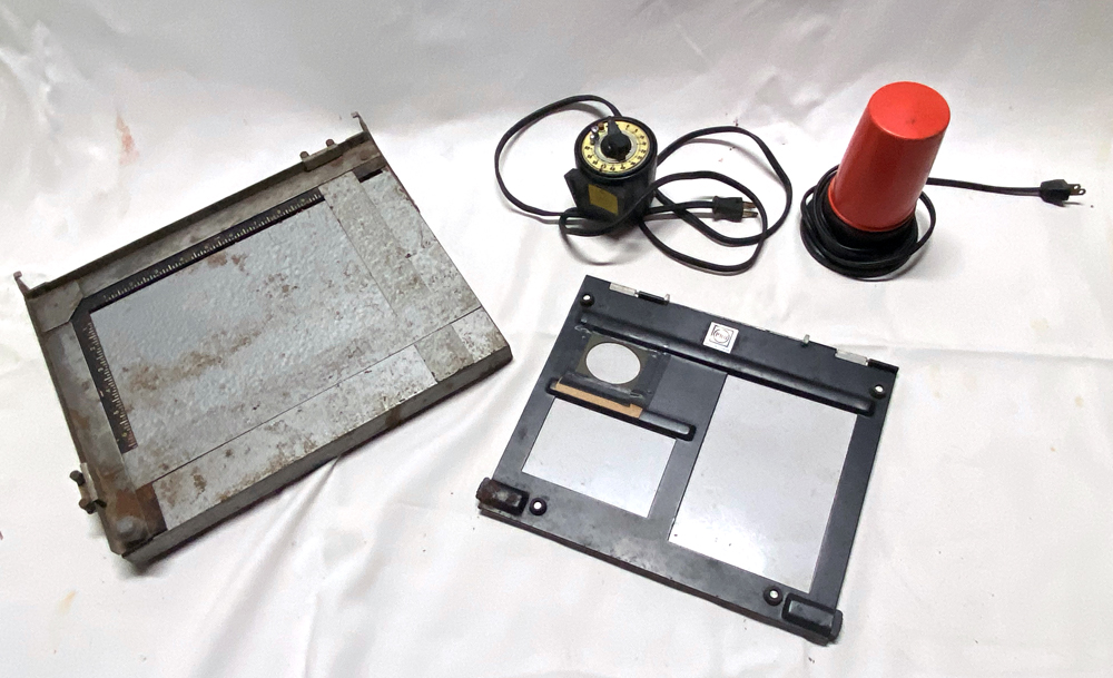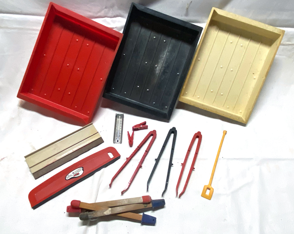 Finally time to let my darkroom go. OMEGA B-600 enlarger, lense, film carrier – complete. These (even just as parts) have recent strong sold records on eBay. Also pictured and included are two easels, timer, darkroom lamp, trays, tongs squeegees, books, film changing bag. Sold as a lot. I also have a large collection of antique darkroom equipment if someone may be interested. If so, happy to assemble and take images.