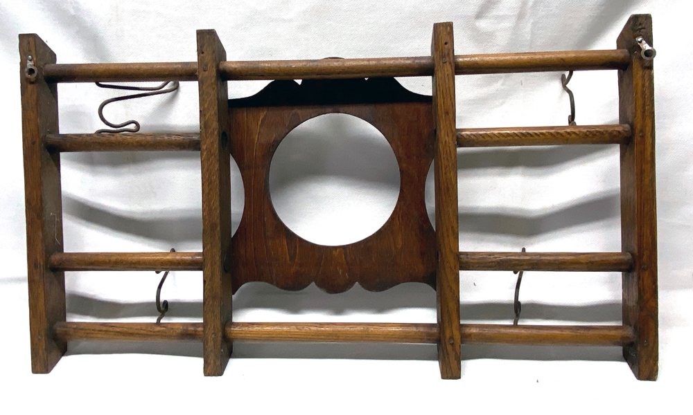 I have had this for decades, hanging it in one time in an 1880s Victorian Camp Meeting Cottage, and later in my home. Overall measures about 24 x 13 3/4 inches, and the center hole is 5 1/2 inches in diameter. Usually you will see a small mirror in the center so you can adjust your hat when you put it on. I do not recall if I even had the mirror for this or not. But – I just cannot keep everything, and time to adorn a new home.