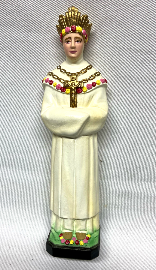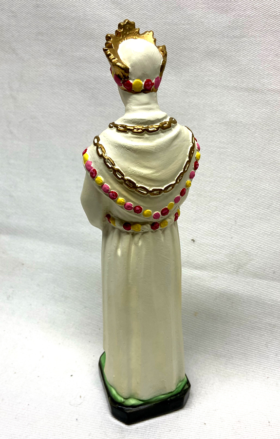 A devoted reader emailed saying, “I believe it is Our Lady of LaSalette.” This resin cast stands about 9 inches tall with a base measuring about 2×2 inches. Lovely robe, Crucifix on neck and Crown on head. An impressive piece I think – $25