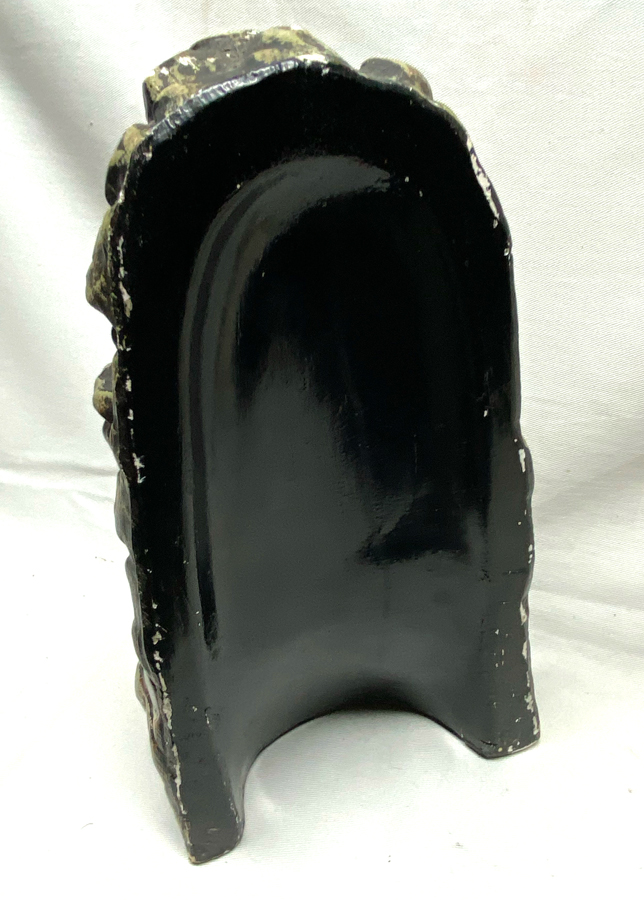 Best for last – large chalk ware Grotto with Mary being adorned, and a removable votive candle. Made by the Penna. Statuary Co., Inc. (c1930s from my research) it measures about 14 1/2 inches high and the base 5 1/2 by about 8 1/2 inches. Some light rubbing and chips, few spots touched up with coloring. My “galleries” may be clicked for larger images to view.