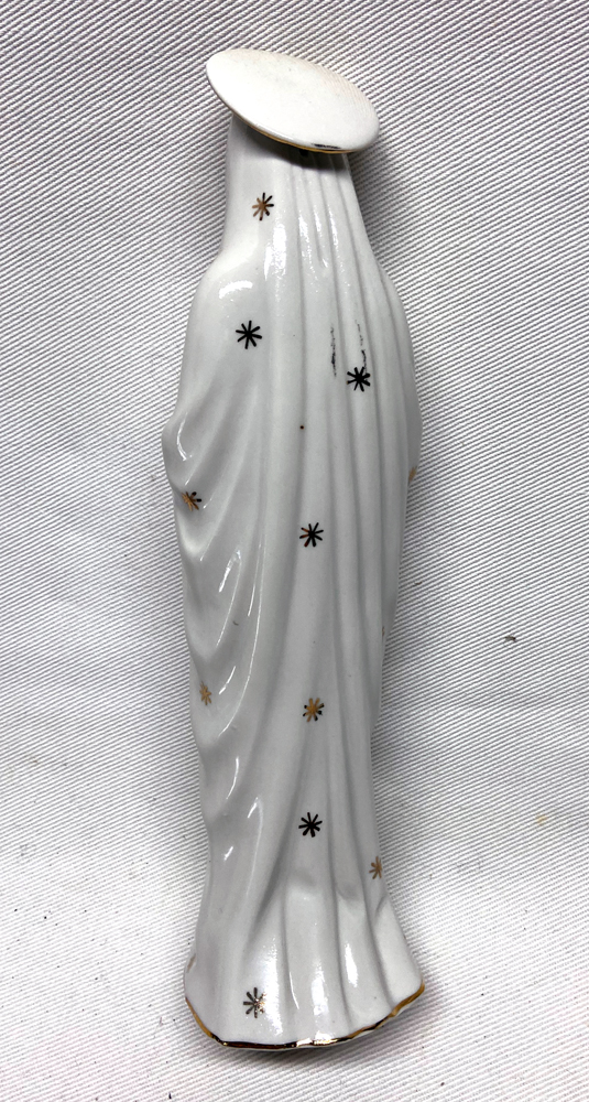 Three smaller Mary statues – Mary on the Blue Base measures about 7 inches tall. Made of plastic by “STAR, NYC, USA” – In the middle is a plastic Mary with FATIMA on the base, and it measures about 5 1/2 inches tale – and on the right is a china Mary, about 7 inches tall. $8 each, or all three as a lot for $20.