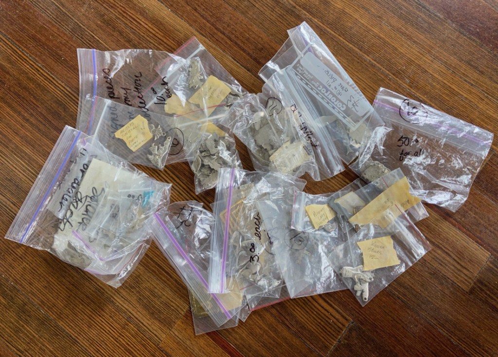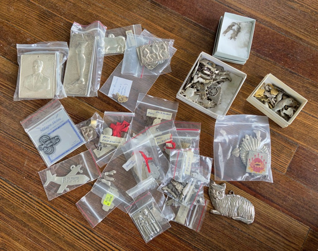 Milagros (also known as an ex-voto or dijes or promesas) are religious folk charms that are traditionally used for healing purposes and as votive offerings placed on church statues, alters, shrines, or other sacred places. Usually found in Mexico and Latin America. Usually they are purchased in churches and cathedrals, or from street vendors just outside. In the late-1990s my late-bride actively collected these. She met one jewelry designer who would make jewelry from the various pieces. That designer sold my Cathy a massive collection, Cathy also collected many other examples, both in silver, cast metals, and pressed tin. I have yet to count the number of pieces nor compile a full listing. I do have receipts for most of her purchases, that total over $2,000. I will eventually count, and illustrate some of the finer examples. Many of the pieces were removed from statues, and are labeled where found, and show some smoke from the burning candles. The various shapes indicate what is being prayed for: heart trouble, etc. This collection must be seen – $1,500