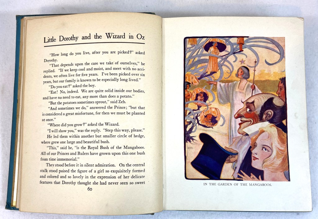 DOROTHY AND THE WIZARD IN OZ with FIRST EDITION POINTS. Published by The Reilly & Britton Co., Chicago, (1908), POINTS for First Edition present include: publisher’s advertisement on verso of half-title page lists three books — ownership page shows a picture of Dorothy — last illustration is Ozma with the words “The End”- Overall a clean, tight, well-read book with some light edge wear, I note a small tear edge of one page. PLEASE NOTE – of the 16 color plates called for TWO ARE LACKING (facing page 50 and facing page 100). First State Binding with Co. — (Hanff, Greene, Martin, Greene, and Haff – BIBLIOGRAPHICA OZIANA pages 53-54). My apologies for the shadow in my images at the lower right corner – lights were set incorrectly.