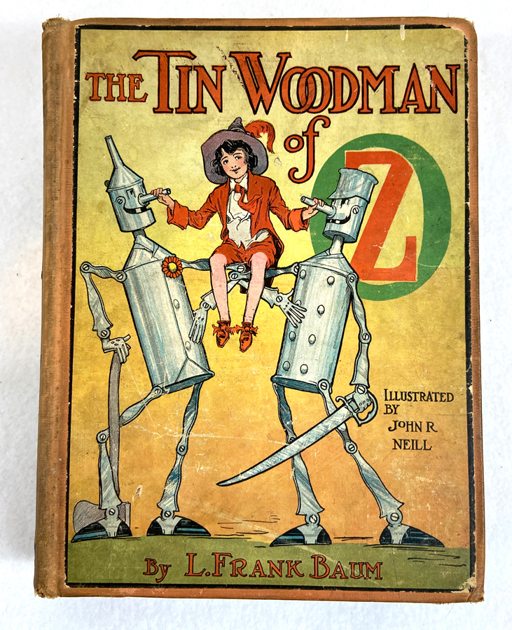 THE TIN WOODMAN OF OZ – Reilly & Lee, Chicago – 1918. First published by The Reilly & Britton Co., and illustrated by John R. Neill, there was just that one printing with Reilly & Britton, and the firm changed to Reilly & Lee in 1919. This earliest Reilly & Lee printing retains the first edition points, including: the same 11 advertisements as the first state, and the color plates have no captions. A good but lightly worn copy as shown in images, and with old repairs to the endpapers – hinges were not broken, just the newsprint like paper was cracked, but now re-glued. NOTE, OF THE 12 TIPPED IN COLOR PLATES – LACKING IS THE PLATE OPPOSITE PAGE 24. — (Hanff, Greene, Martin, Greene, and Haff – BIBLIOGRAPHICA OZIANA pages 73-74). My apologies for the shadow in my images at the lower right corner – lights were set incorrectly.